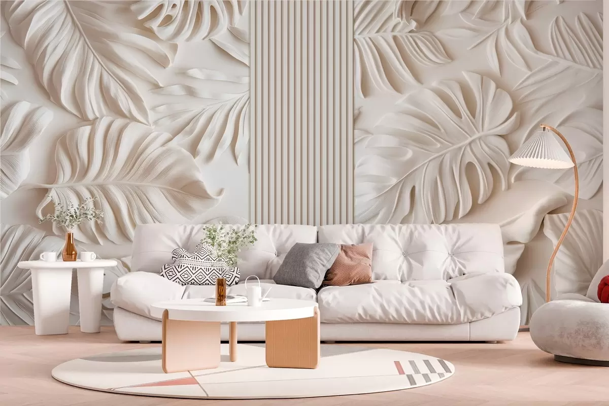 Fototapety veľké tropické listy imitujúce basreliéf a panely vo svetlých farbách Nr. w03119