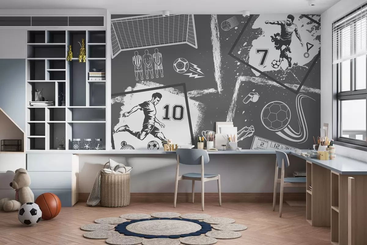 Fototapety Futbalisti, lopta a ďalšie futbalové atribúty v sivých tónoch Nr. w03122v1
