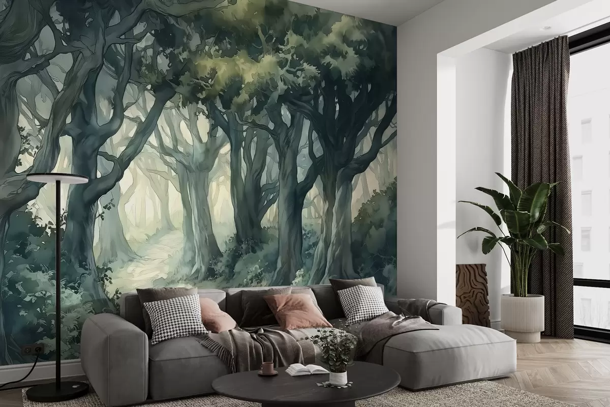 Fototapety Les s veľkými stromami, zelená farba spallete, akvarel štýl kresby Nr. w03150