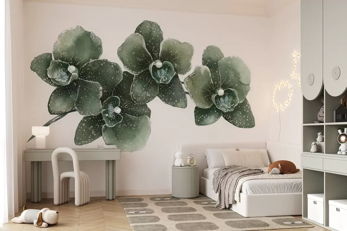Fototapety Orhid kvet vetva, akvarel štýl, kvetinové, zelené farby Nr. w03165v1