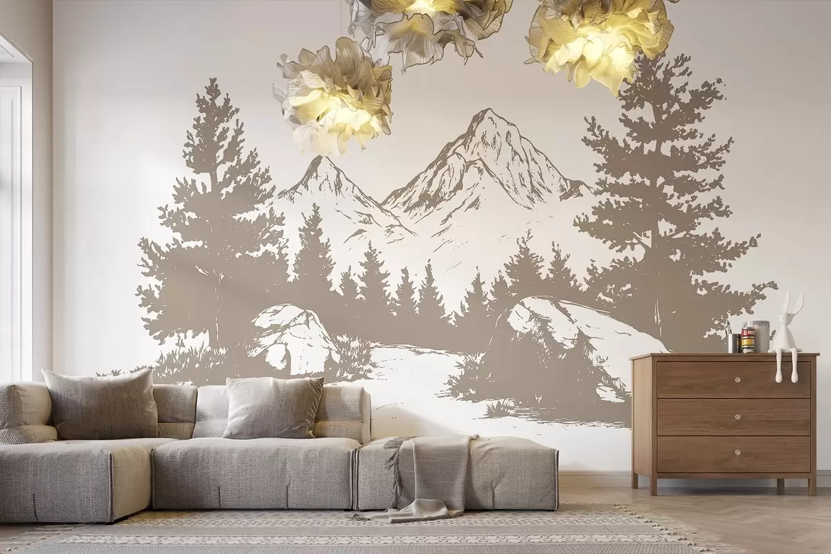 Fototapety Alpy, hory s lesom, lineárna kresba, béžová farba Nr. w03342