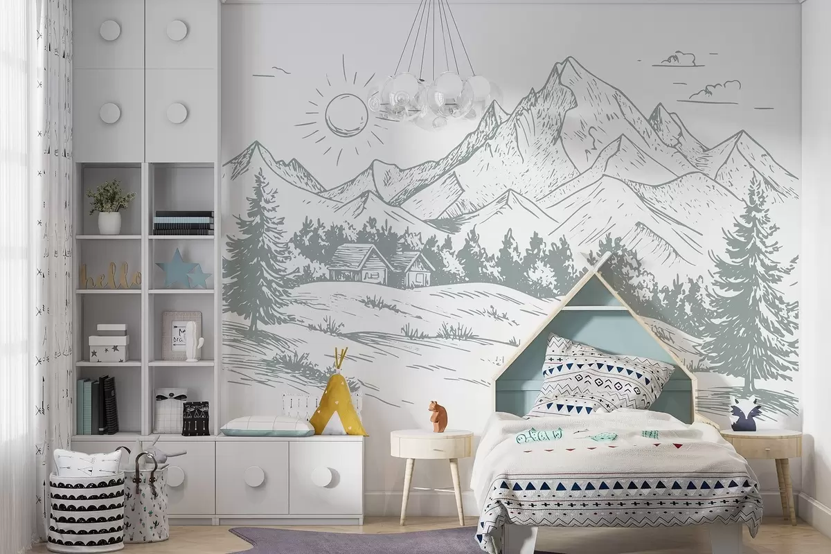 Fototapety Hory kresba, príroda krajiny, les, drevené domy, mentolová farba Nr. w03347v1