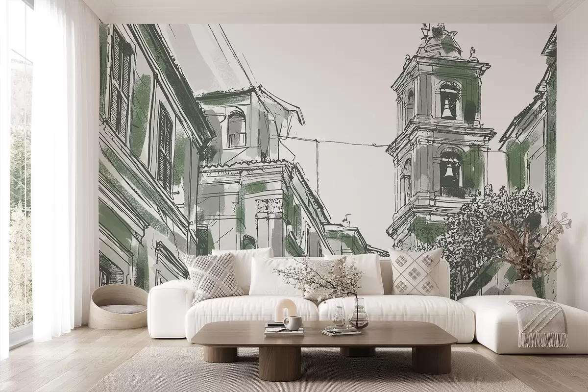 Fototapety Stredomorská mestská ulica, kaplnka, architektúra, sivé a zelené farby Nr. w03350v2