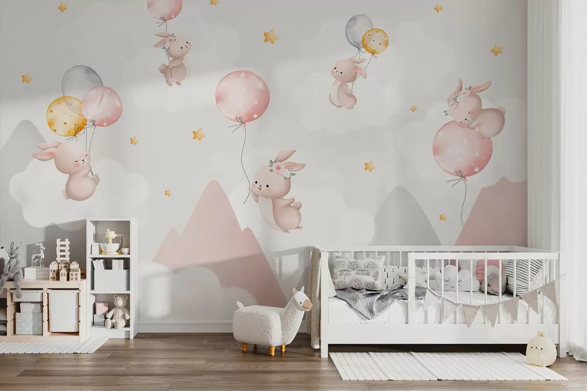 Fototapety Zajačiky s balónmi na oblakoch medzi vrcholmi hôr Nr. w03375