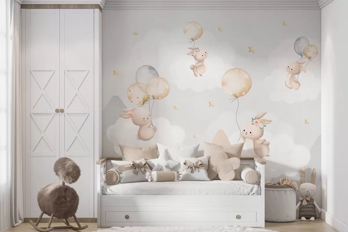 Fototapety Zajačiky s balónmi na oblakoch medzi vrcholmi hôr Nr. w03375v1