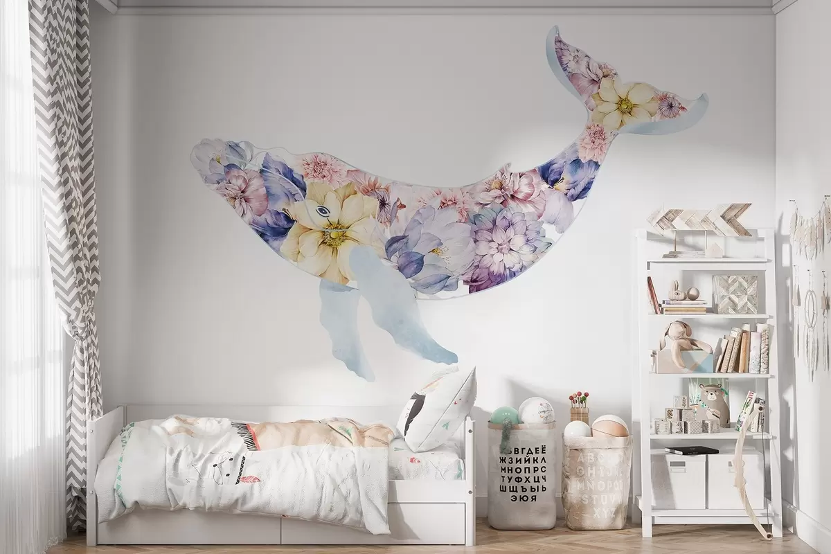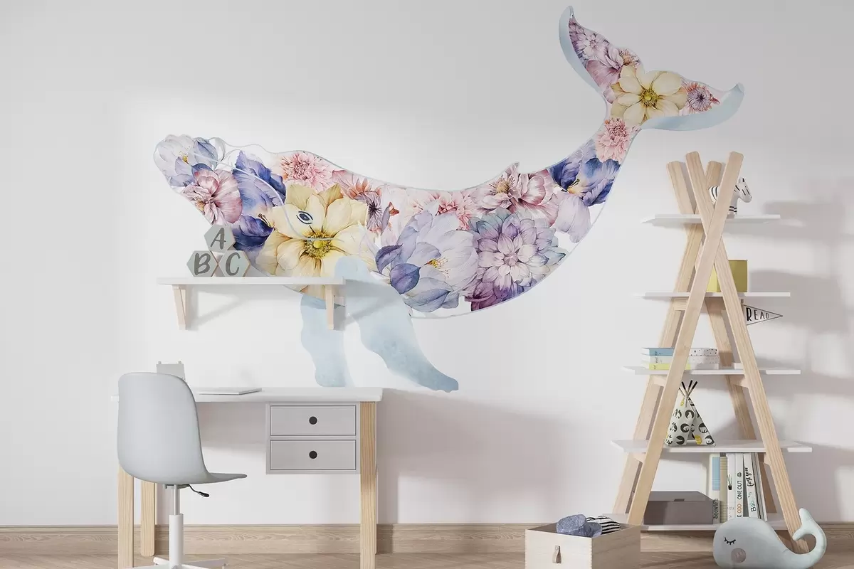 Fototapety Krásna veľryba s akvarelovými kvetmi, morské zvieratá, farebné Nr. w03445
