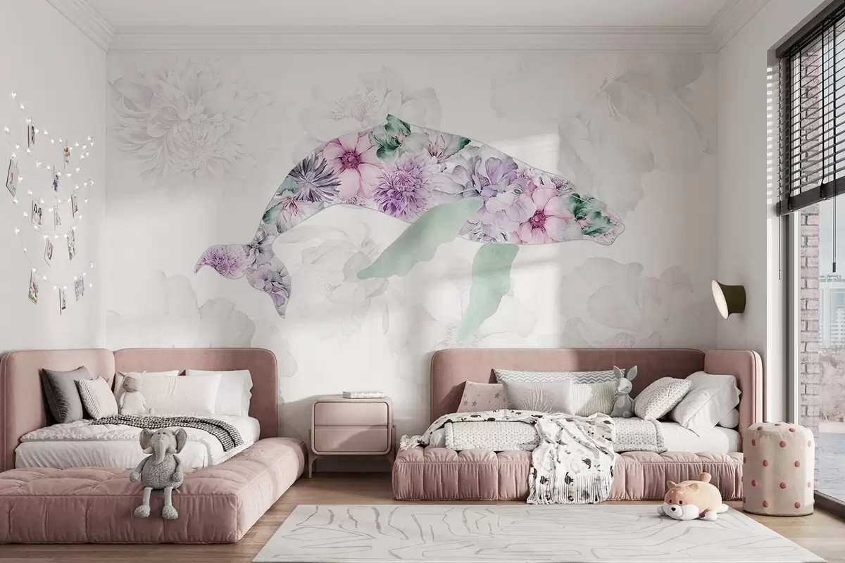 Fototapety Veľryba s akvarelovými kvetmi, oceánske zvieratá, minimalizmus, ružová a zelená Nr. w03446v1