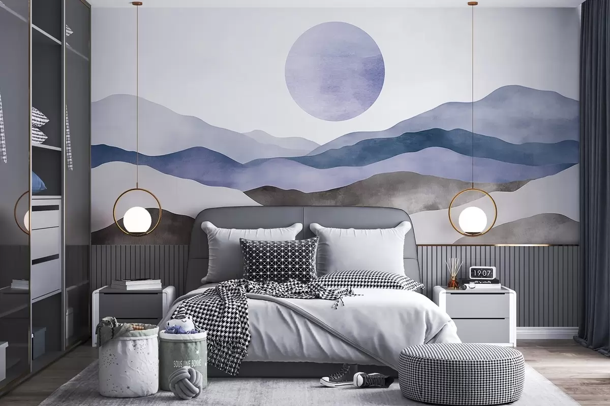Fototapety Akvarelové hory so slnkom, boho štýl, fialová, modrá, sivá Nr. w03551v1