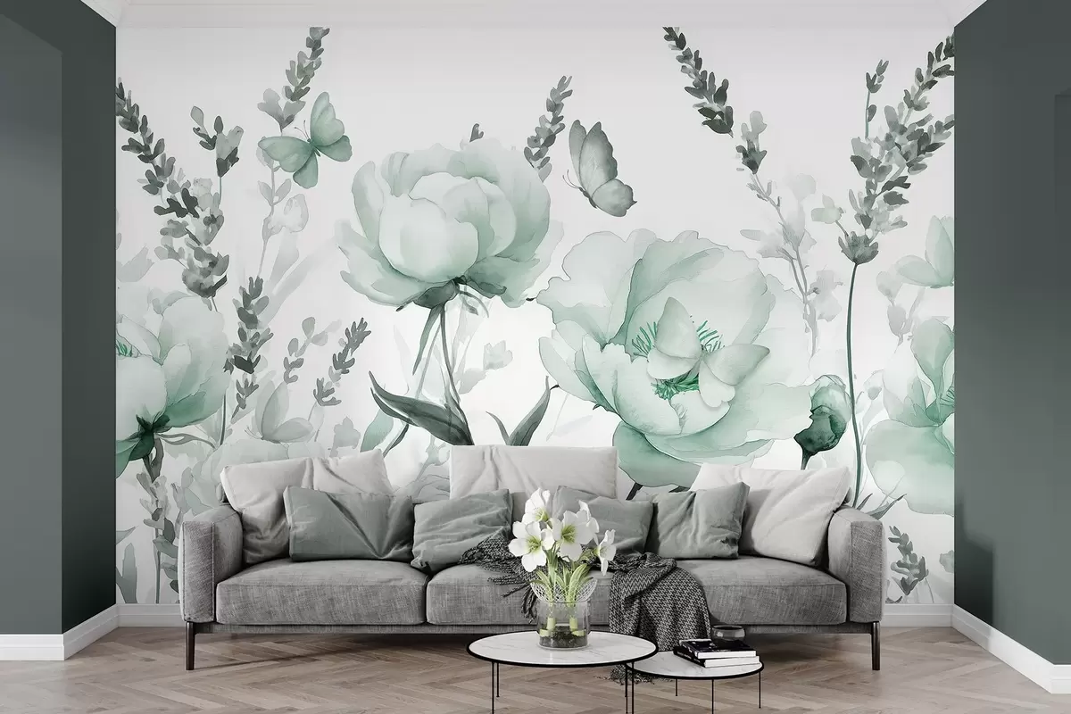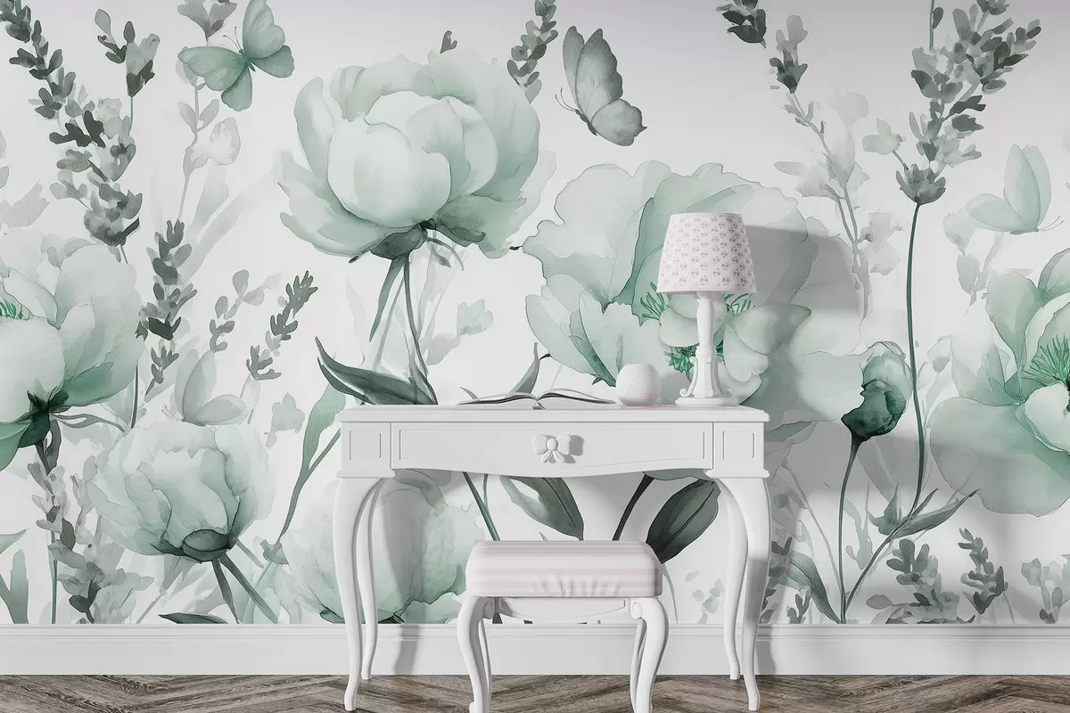 Fototapety Kvetinová lúka, pivonky, levanduľa, motýle, akvarel, zelené farby Nr. w03668v1