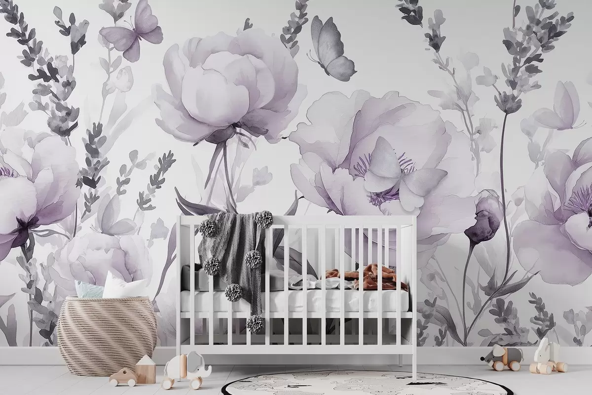 Fototapety Kvetinová lúka, pivonky, levanduľa, motýle, akvarel, farby žiakov Nr. w03668v3