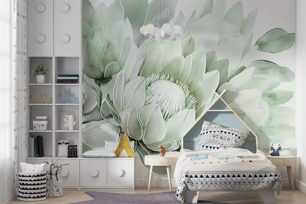 Fototapety Krásne kvety protea, kresba, tropické, zelené farby Nr. w03669v2