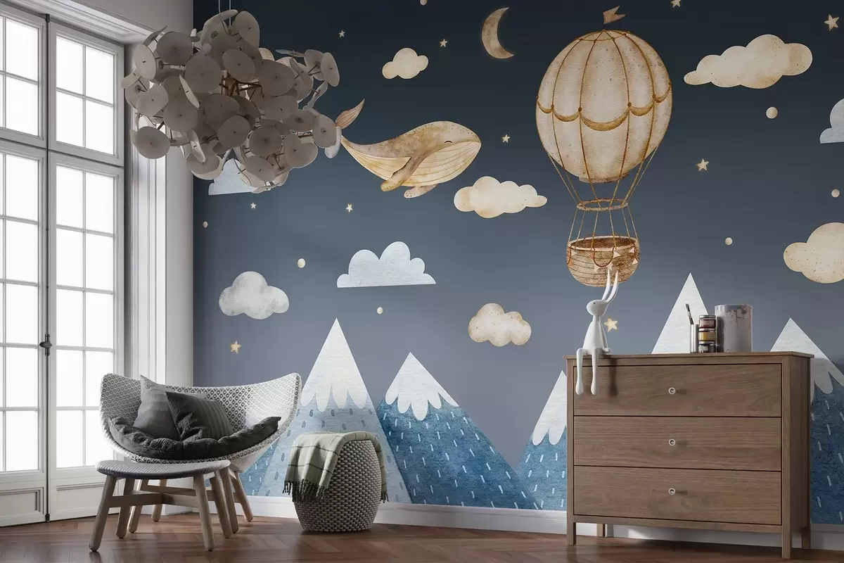 Fototapety Vzdušný balón, roztomilá veľryba, tmavá hviezdna obloha, hory, akvarel, modré a béžové farby Nr. w03672v1