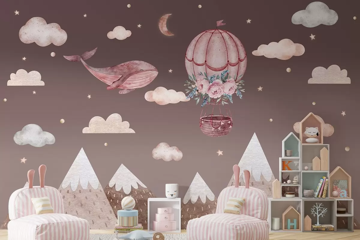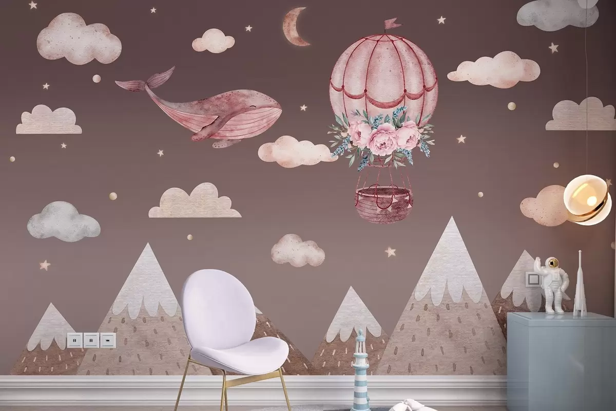 Fototapety Roztomilá veľryba s balónom, tmavá obloha s mrakmi, hory, akvarel, ružové farby Nr. w03673v1