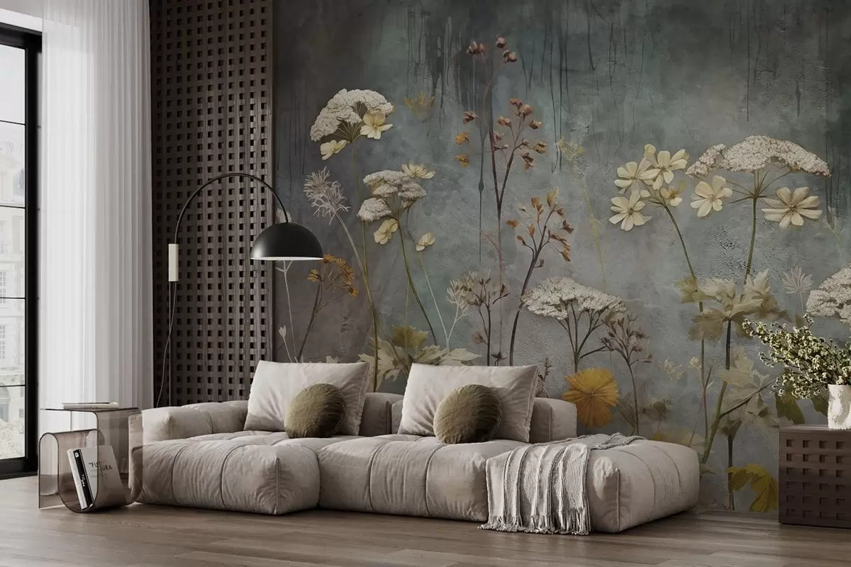 Fototapety Divoké kvety a trávy na pozadí grunge steny Nr. w03697
