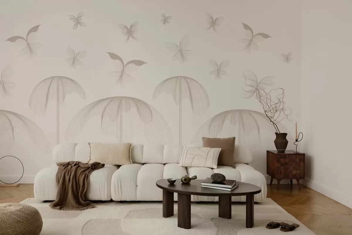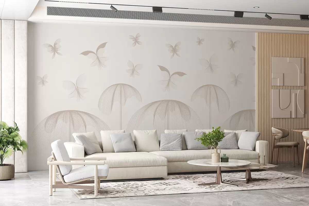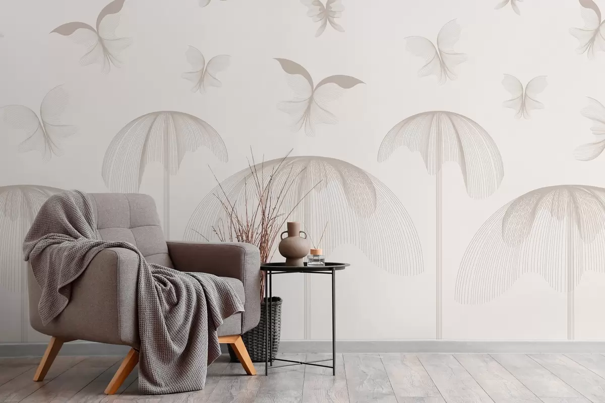 Fototapety minimalistické lineárne tapety motýle a fontány na mliečnom pozadí Nr. w03762