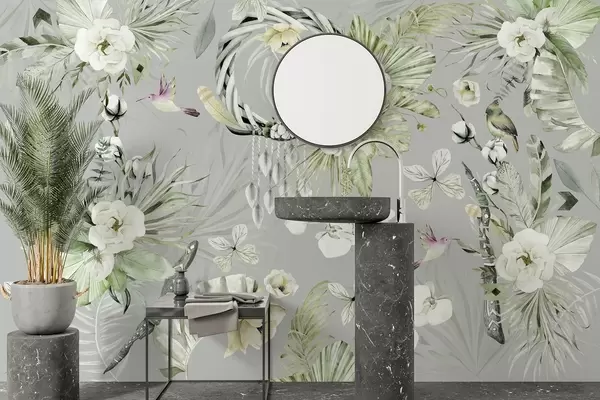 Fototapety Ozdoba v boho štýle s kvetmi pivónie a vtákmi, akvarelový štýl, zelené farby Nr. w03885v2