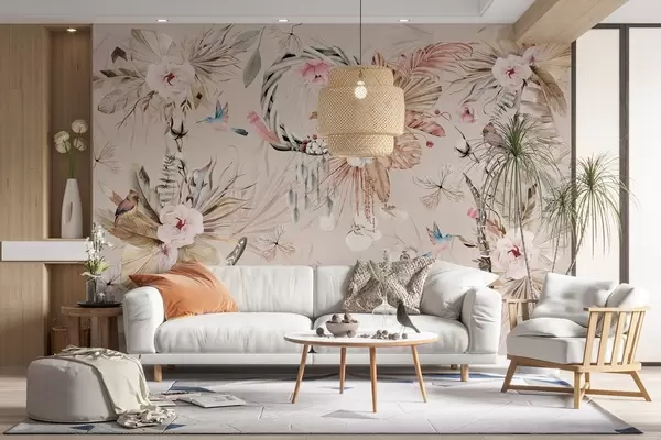 Fototapety Ozdoba v boho štýle s kvetmi pivónie a vtákmi, akvarelový štýl, jemné farby w03885v3