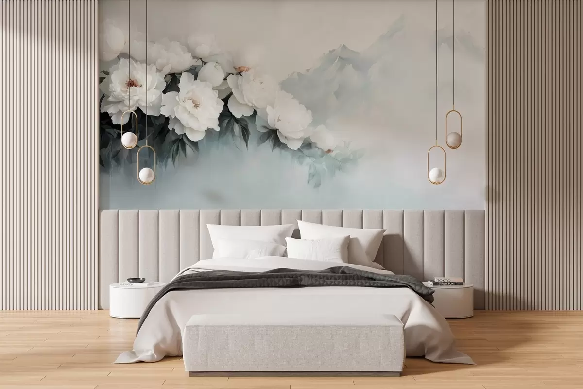Fototapety malebné svieže biele pivonky na pozadí hmlistých hôr Nr. w03965