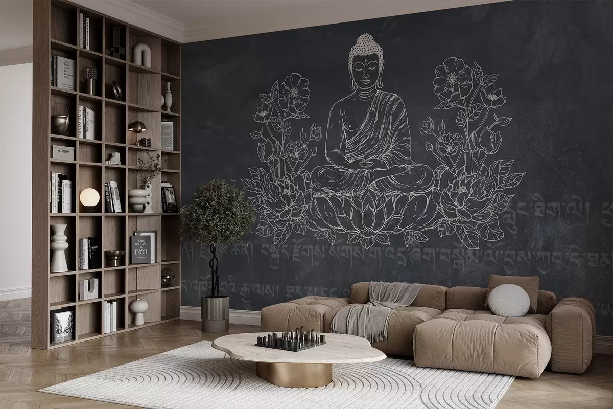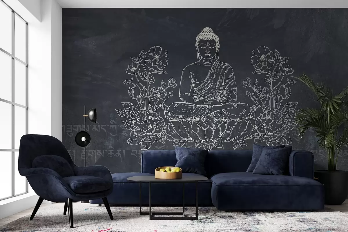 Fototapety Meditujúci Budha s lotosovými kvetmi, line art, orientálne, tmavé pozadie Nr. w04008