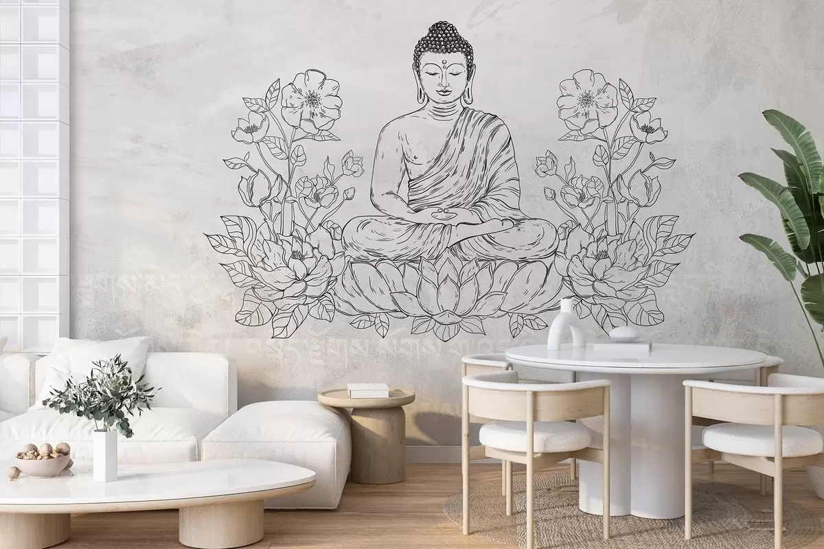 Fototapety Meditujúci Budha s lotosovými kvetmi, line art, orientálne, béžové pozadie Nr. w04008v1