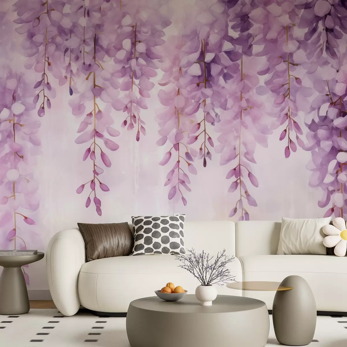 Fototapety Jemná akvarelová kompozícia s kaskádovitou vistériou v jemných levanduľových a ružových tónoch, ktorá vytvára pokojnú, Nr. w04034