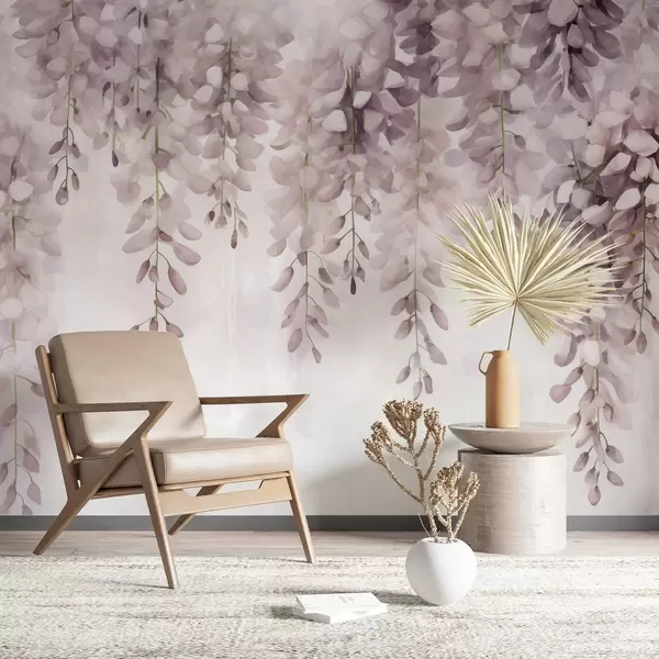 Fototapety Mäkká akvarelová scéna v krémovo ružových tónoch s kaskádovitými trsmi vistárie, ktoré tvoria zasnenú kvetinovú oponu Nr. w04034v2