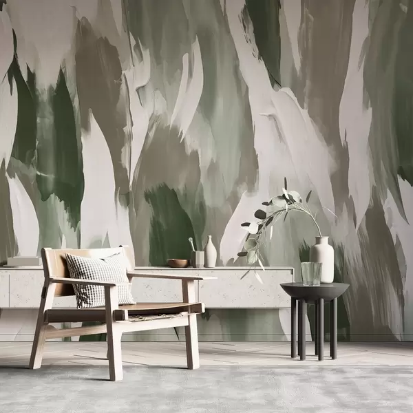 Fototapety Abstraktná kompozícia ťahov štetcom v zemitej zelenej, sivej a slonovinovej farbe, ktorá evokuje uzemnený, prírodou inšpirovaný rytmus Nr. w04035v1