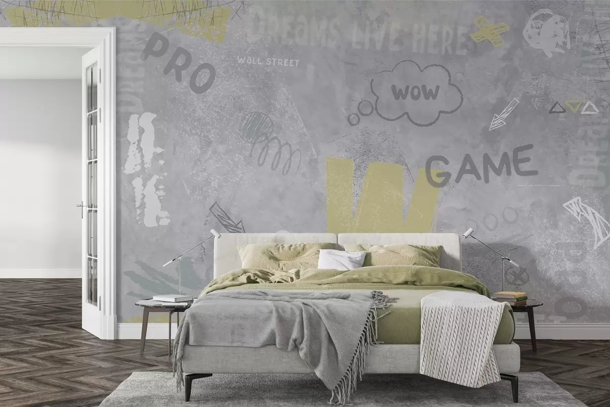 Fototapety Dizajn v štýle street artu so žltými nápismi na pozadí betónovej steny Nr. w04056