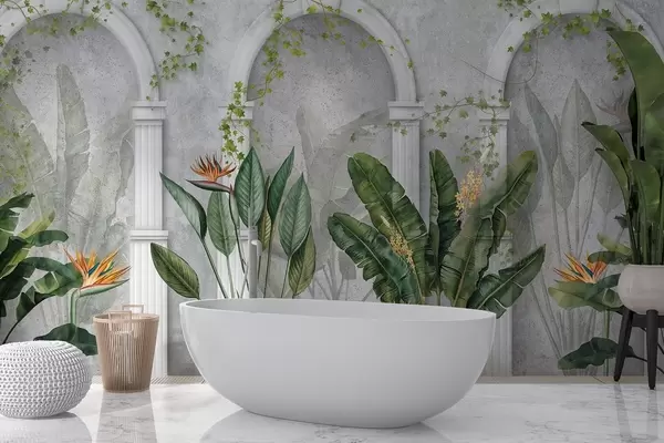 Fototapety Betónová stena s oblúkmi a tropickými rastlinami, kvetinové, prírodné farby Nr. w04065