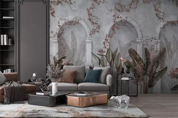 Fototapety Betónová stena s oblúkmi a tropickými rastlinami, kvetinové, bordové farby Nr. w04065v1