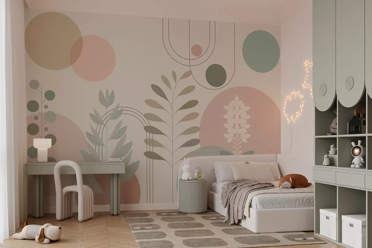 Fototapety geometrická abstrakcia s kruhmi a štylizovanými rastlinami na krémovom pozadí Nr. w04070
