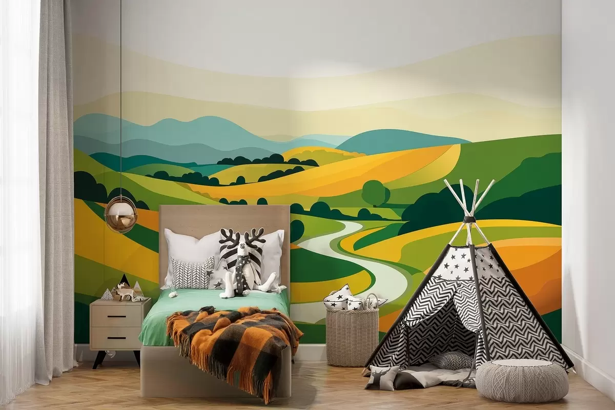 Fototapety Abstraktná krajina s kopcami a stromami, živé farby Nr. w04116