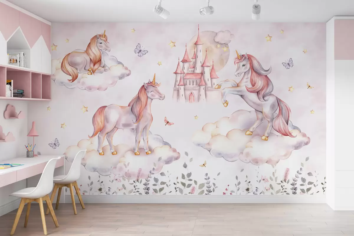 Fototapety Jednorožce v oblakoch s hviezdami, motýľmi a kvetmi Nr. w04165