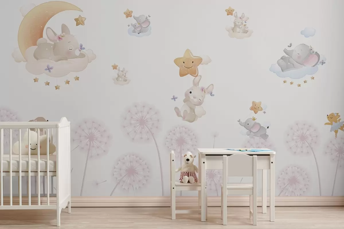 Fototapety Roztomilý zajac a hviezdy medzi púpavami na bielom pozadí Nr. w04195