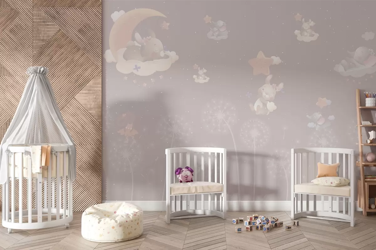 Fototapety Rozprávková noc so zajacom a púpavami na ružovom pozadí Nr. w04195v2