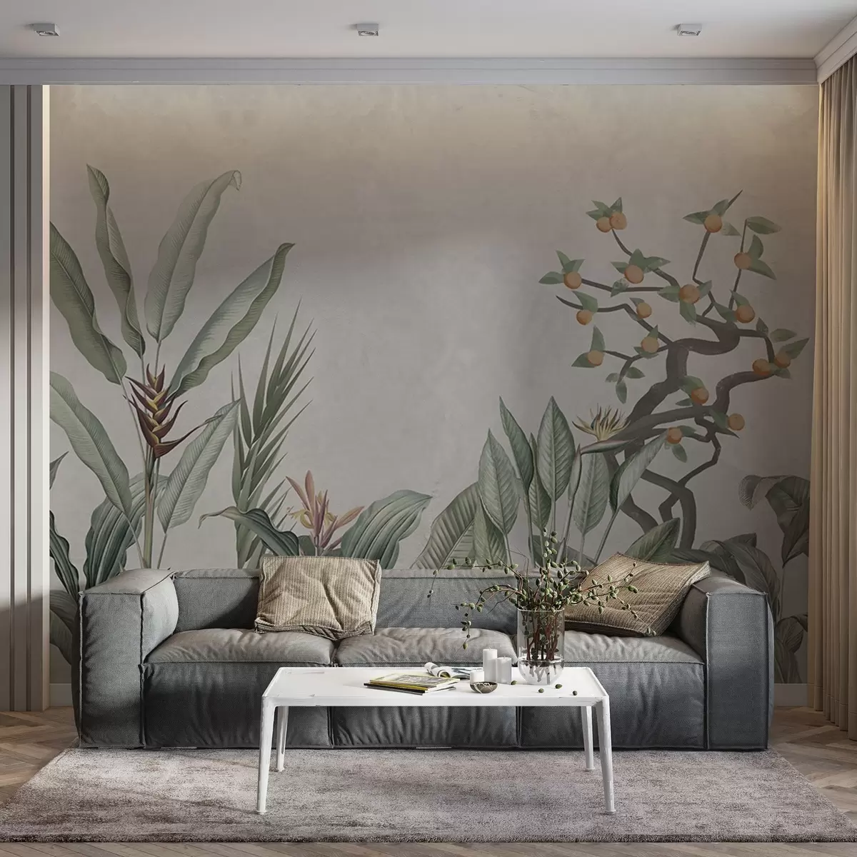 Fototapety Tropická kompozícia s rastlinami a stromom na sivastom pozadí Nr. w04201v1