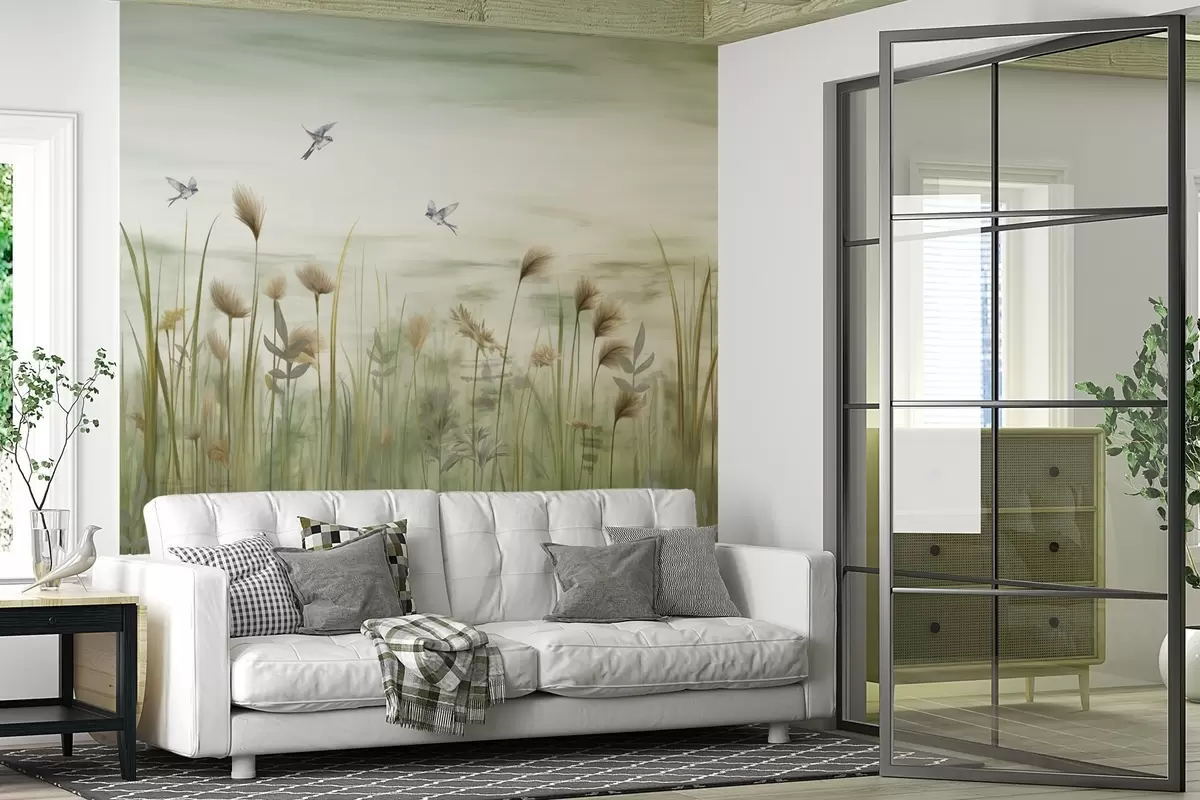 Fototapety Trávnatá krajina s lastovičkami na pozadí jemnej oblohy Nr. w04258v1