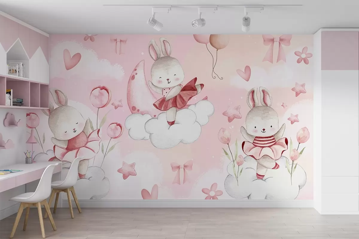 Fototapety Králiky v ružových baletných šatách na oblakoch Nr. w04333
