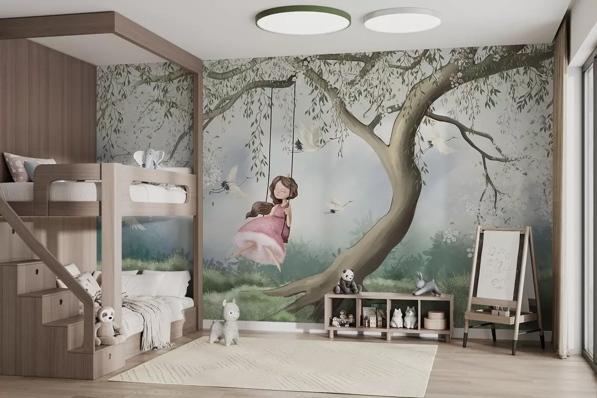 Fototapety Dievča na hojdačke pod kvitnúcim stromom s lietajúcimi vtákmi Nr. w04370