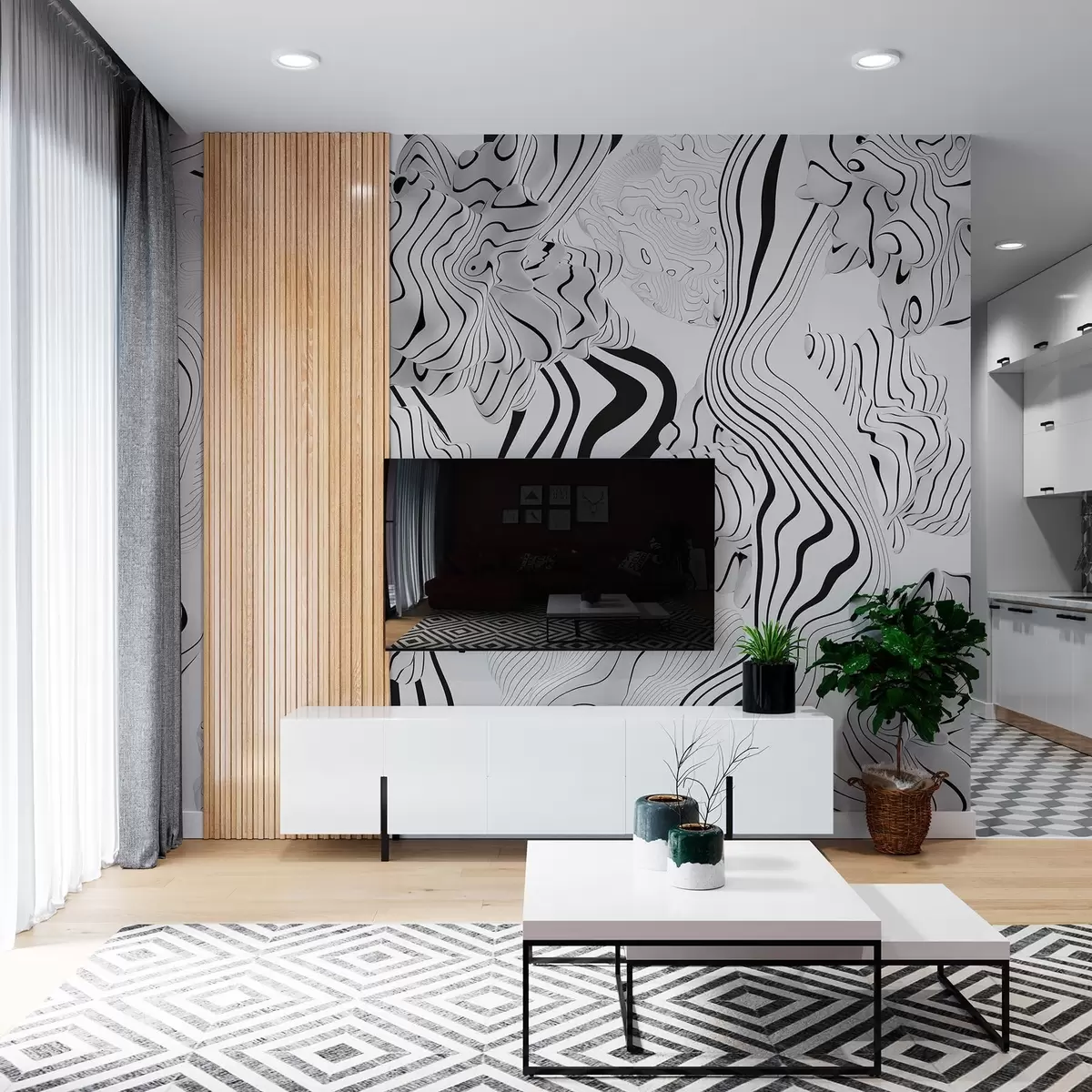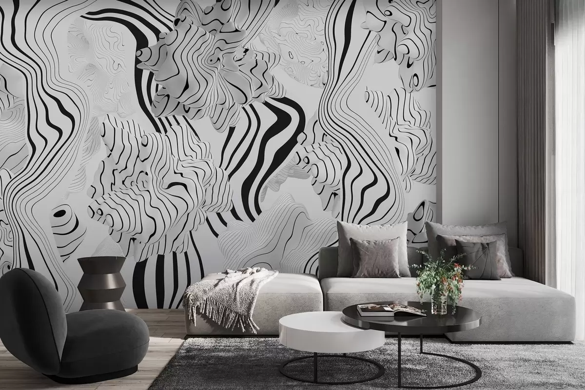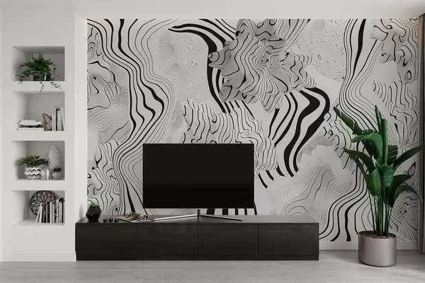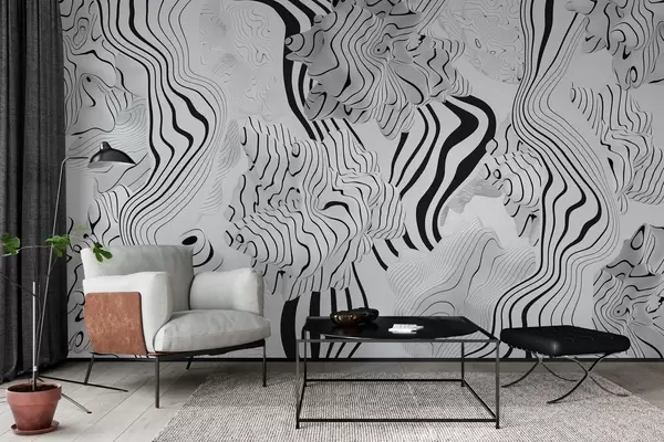 Fototapety abstraktné organické tvary v 3D štýle v bielych a sivých odtieňoch s čiernymi pruhmi Nr. w04627