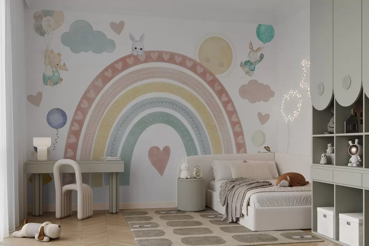 Fototapety Pastelová dúha so srdiečkami, zvieratkami a balónikmi Nr. w04681