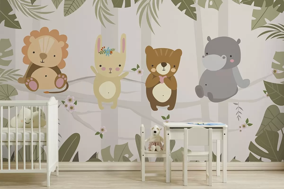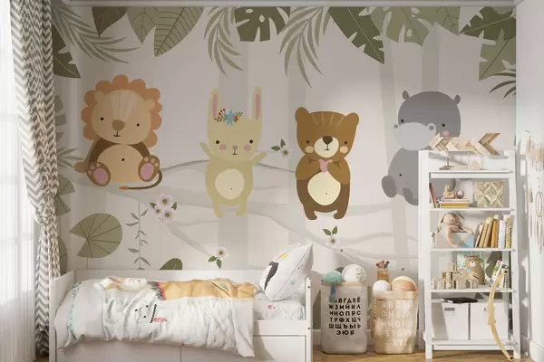 Fototapety Roztomilý lev, zajačik, medveď a hroch medzi listami Nr. w04682