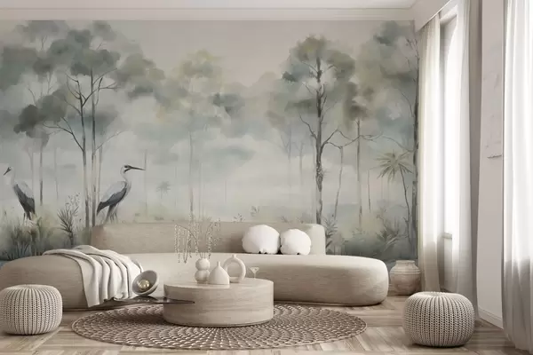 Fototapety Hmlistý les pri vode s volavkami, jemná chladná paleta farieb Nr. w04788
