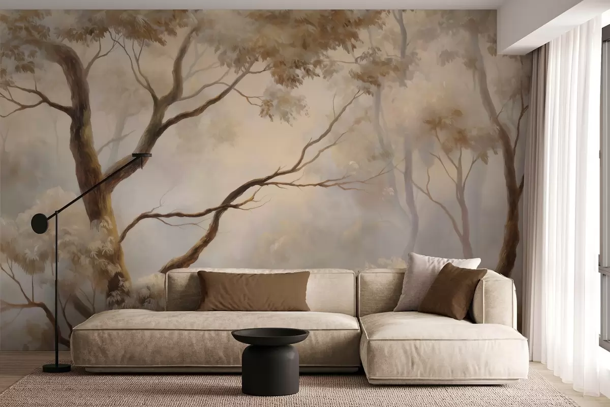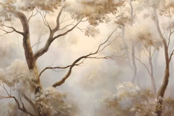 Fototapety Les v ľahkej rannej hmle. Jemný atmosférický obraz v štýle umeleckej krajiny. Nr. w04817