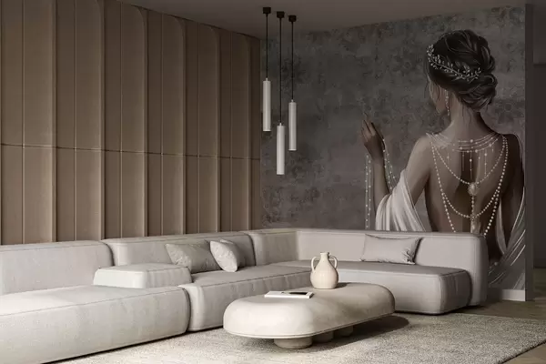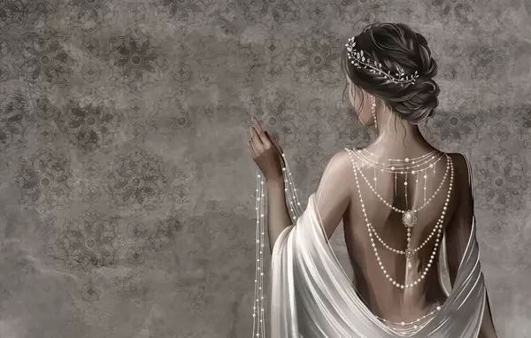 Fototapety Žena videná zo zadnej strany s perlami, sivé pozadie s kamenným vzorom Nr. w04854