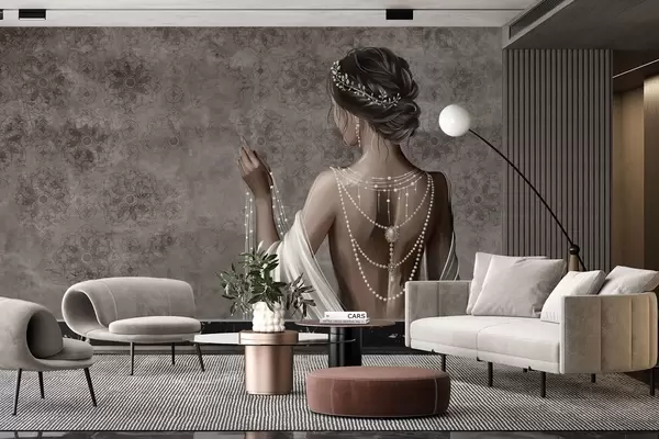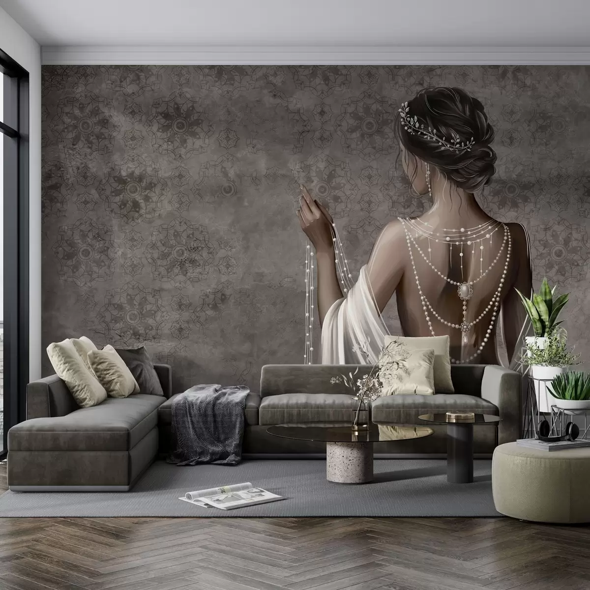 Fototapety Žena videná zo zadnej strany s perlami, sivé pozadie s kamenným vzorom Nr. w04854