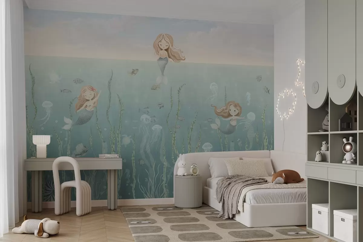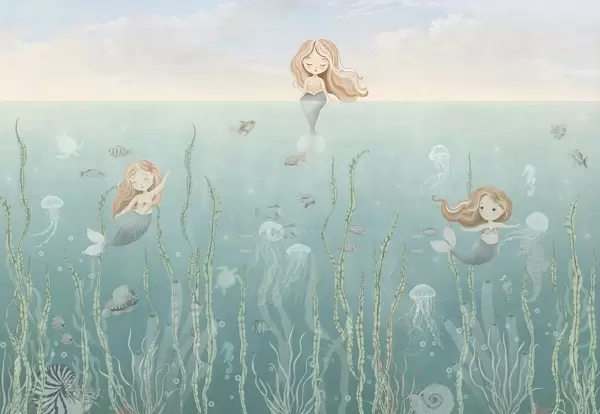 Fototapety Hravé morské panny pod vodou s morskými riasami, medúzami a rybami Nr. w04860
