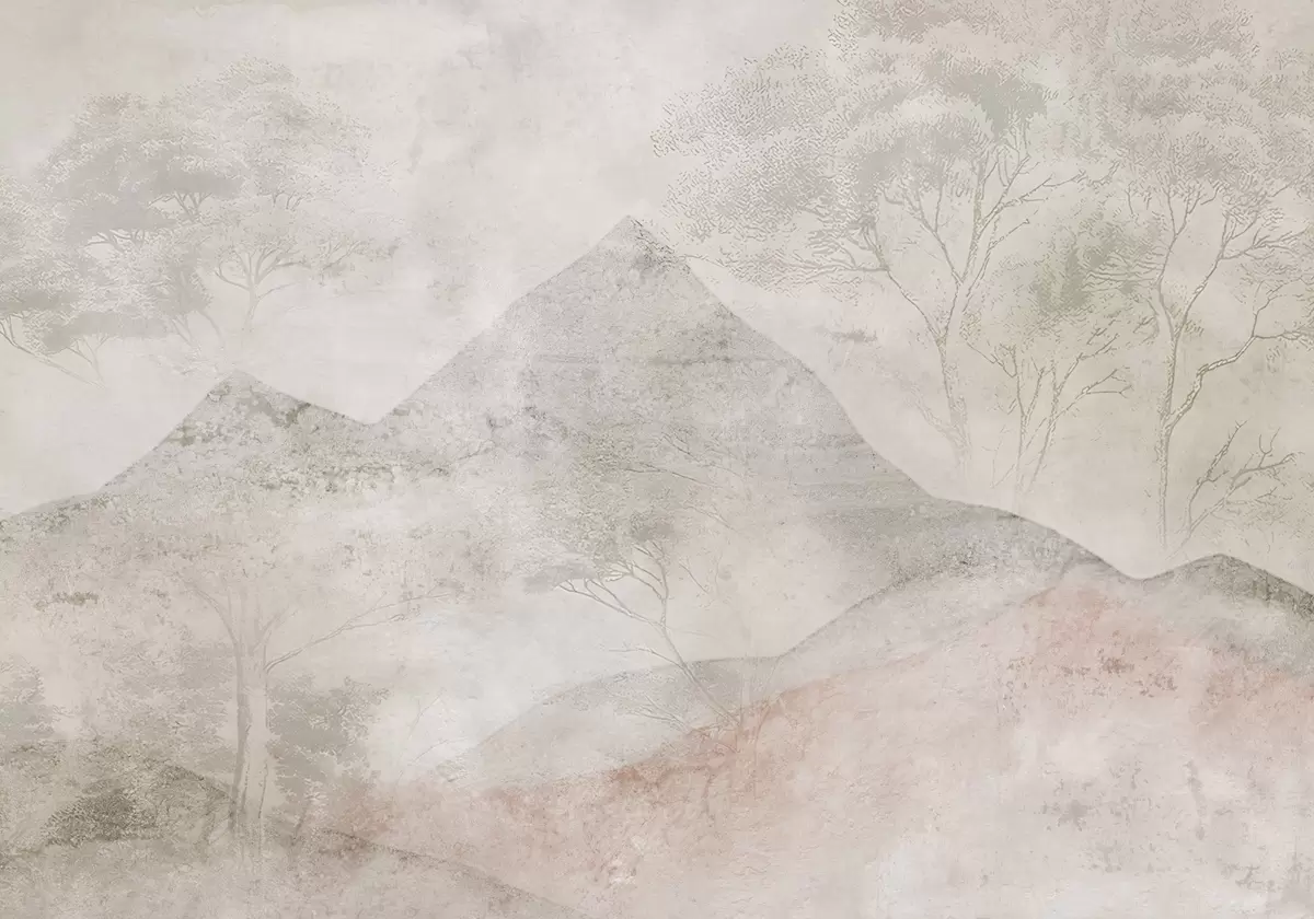 Fototapety Mäkké pastelové hory a stromy v ľahkej hmle Nr. w04954