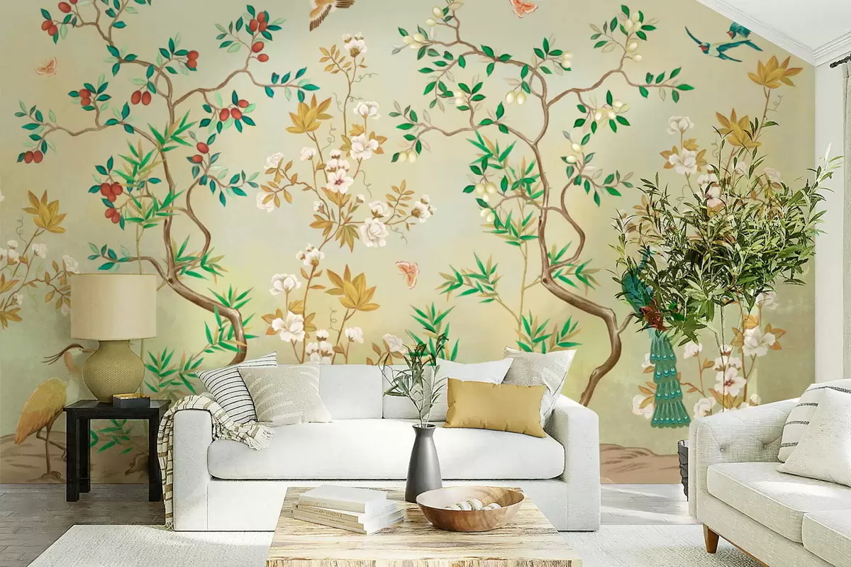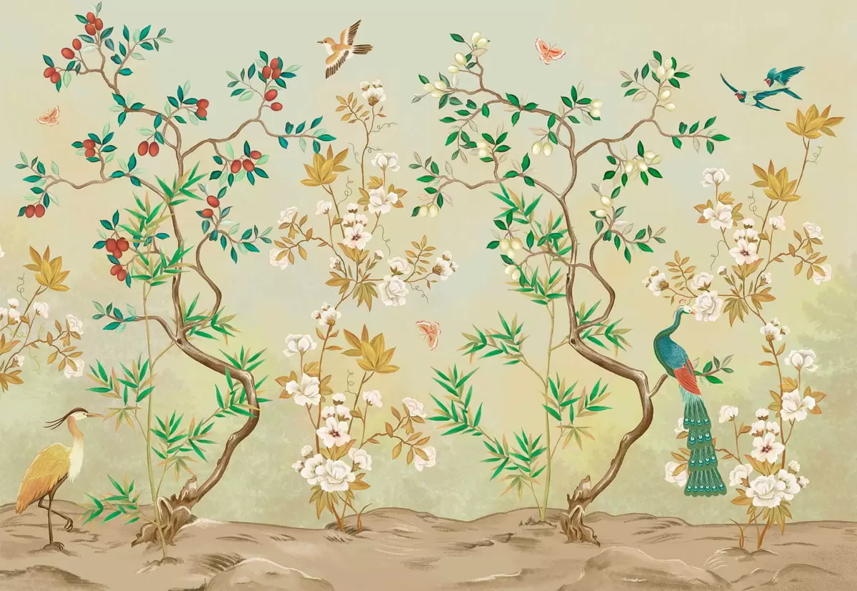 Fototapety Scéna so stromami, kvetmi a vtákmi, svetlé pozadie Nr. w05004v1