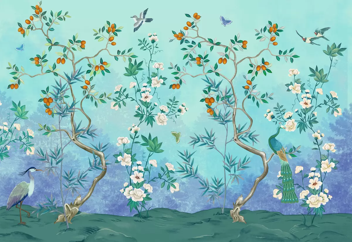 Fototapety Scéna so stromami, kvetmi a vtákmi, modré pozadie Nr. w05004v2